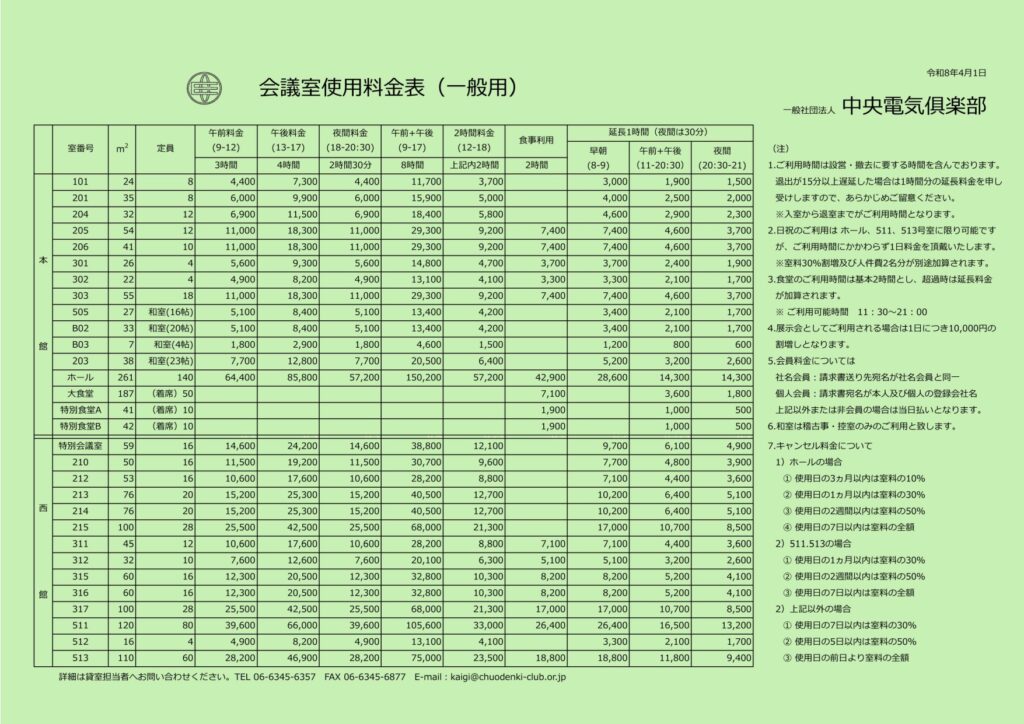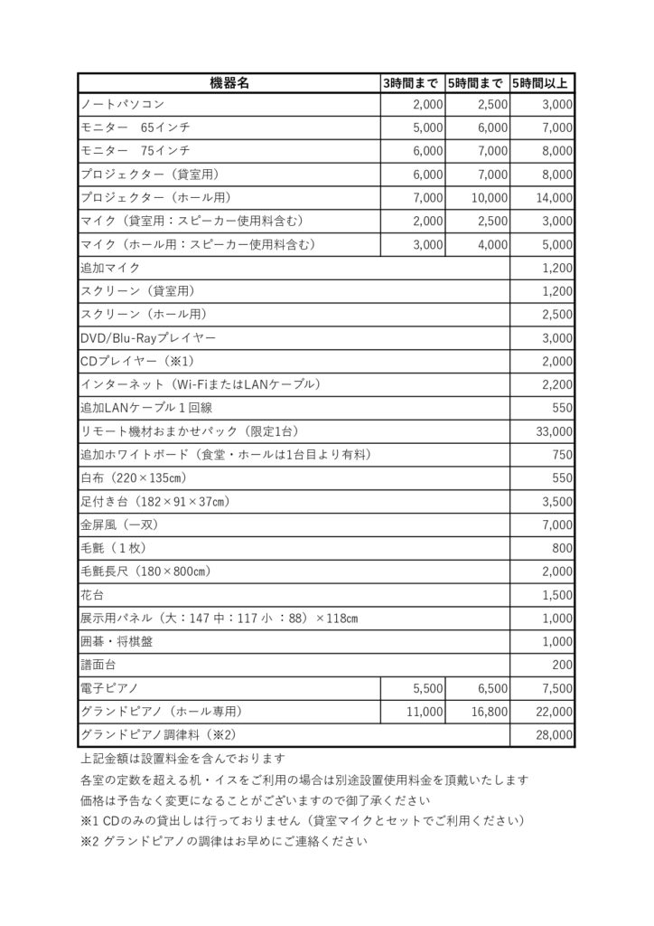 さて、令和8年4月1日より、貸室料ならびに貸付機器使用料金につきまして、